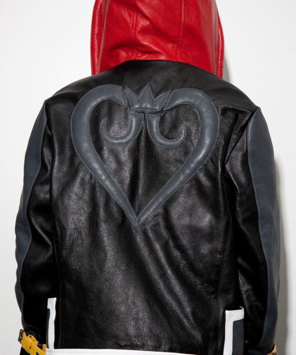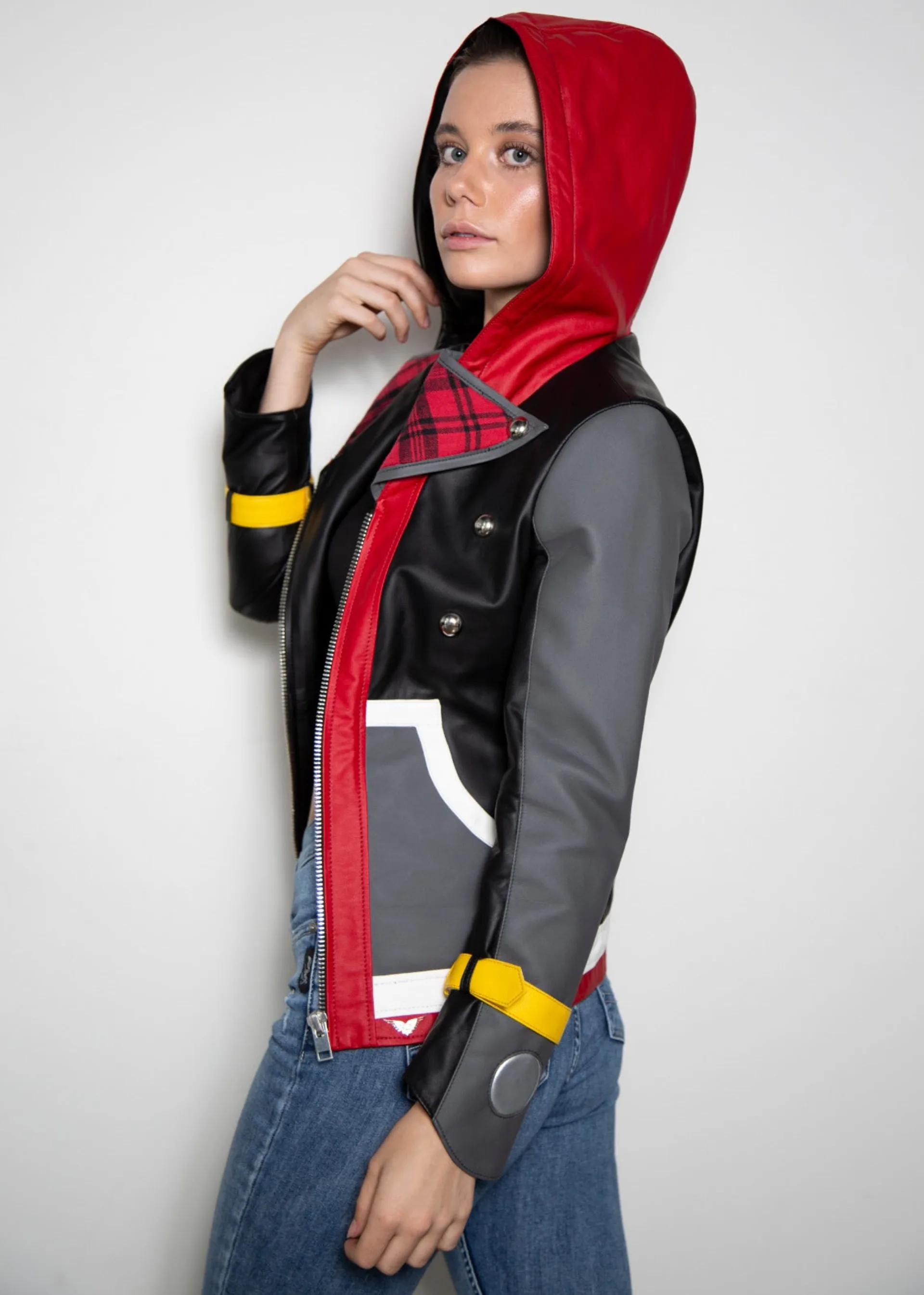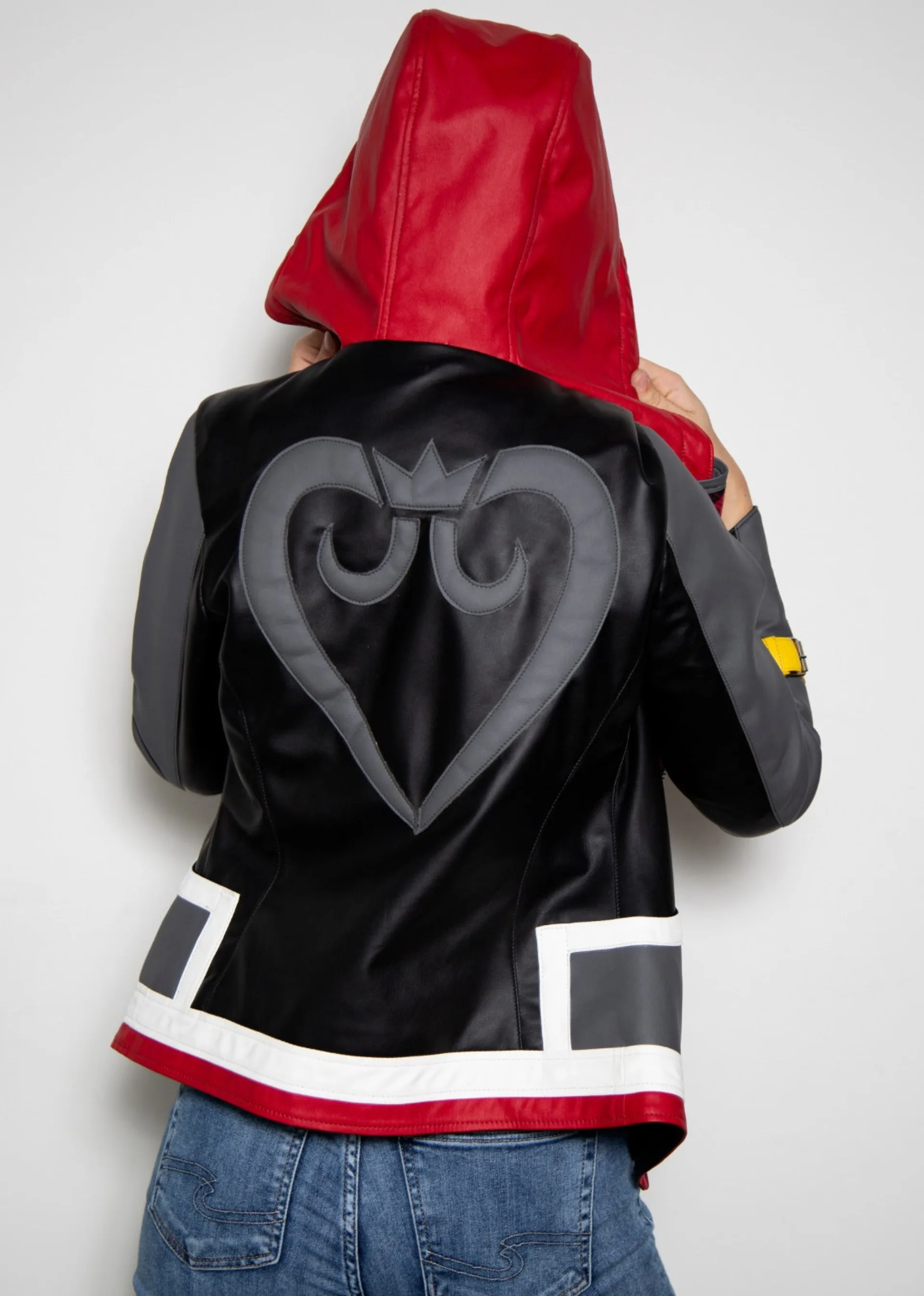 This handcrafted Kingdom Hearts jacket for women is inspired by Sora, the hero of the Kingdom Hearts video game series. Fashionable and functionally wearable, the Kingdom Hearts Sora leather jacket is handcrafted from designer quality vegan or real leather. Two outer pockets add functionality to this punk rock Sora leather jacket. Soft viscose inner lining offers all day comfort, while the red leather hood lends extra style to this KH3 Sora jacket.