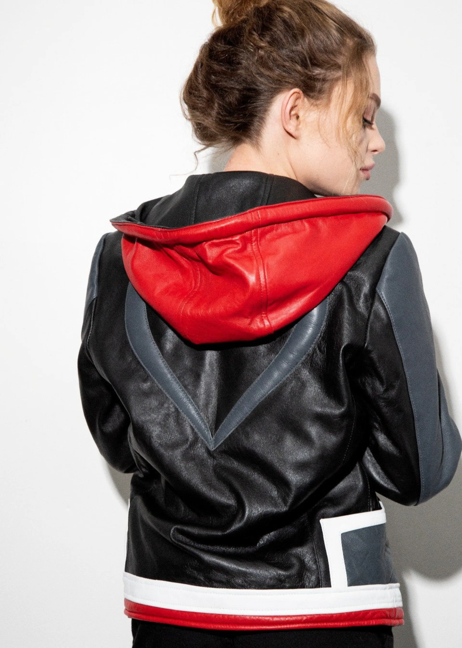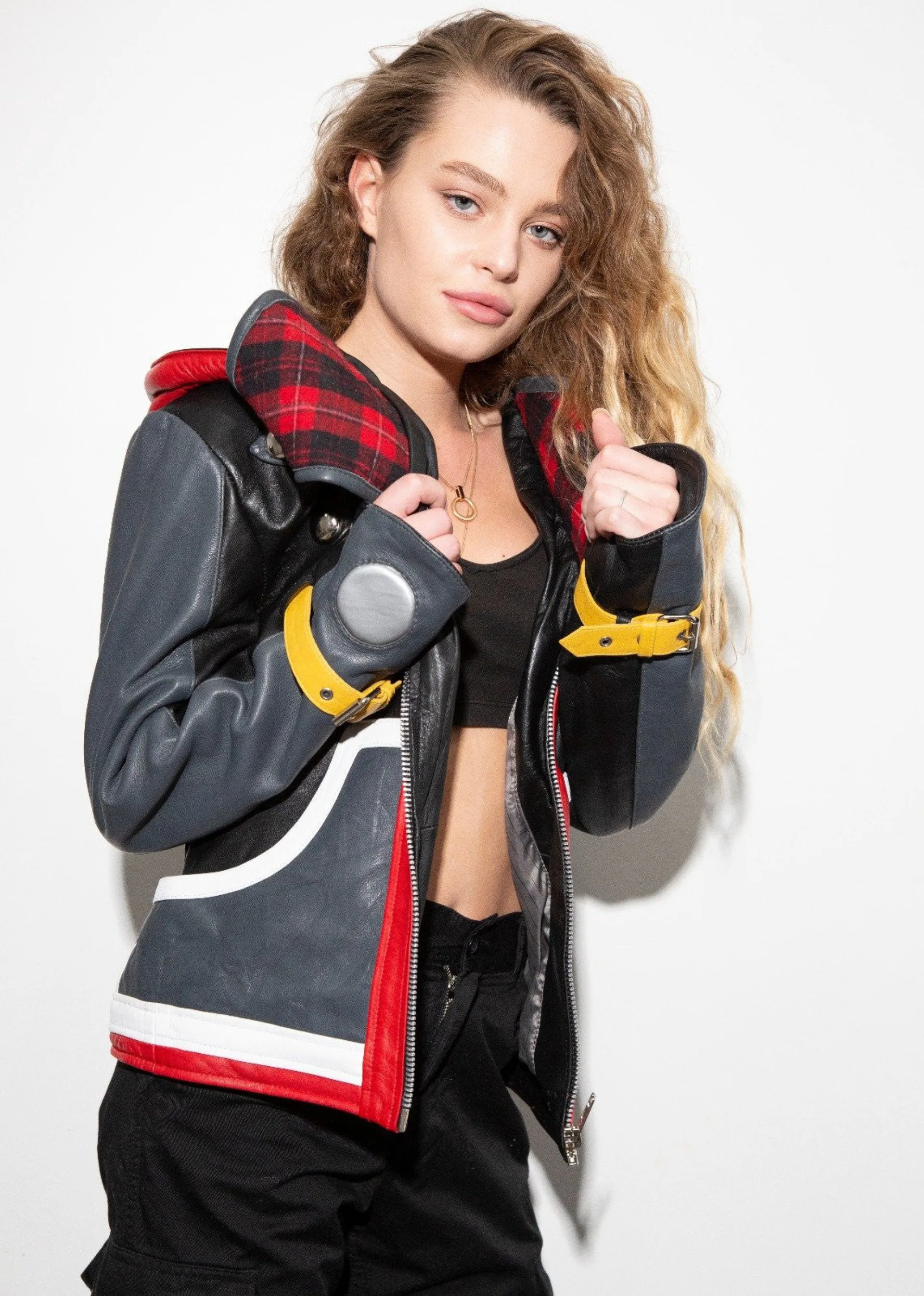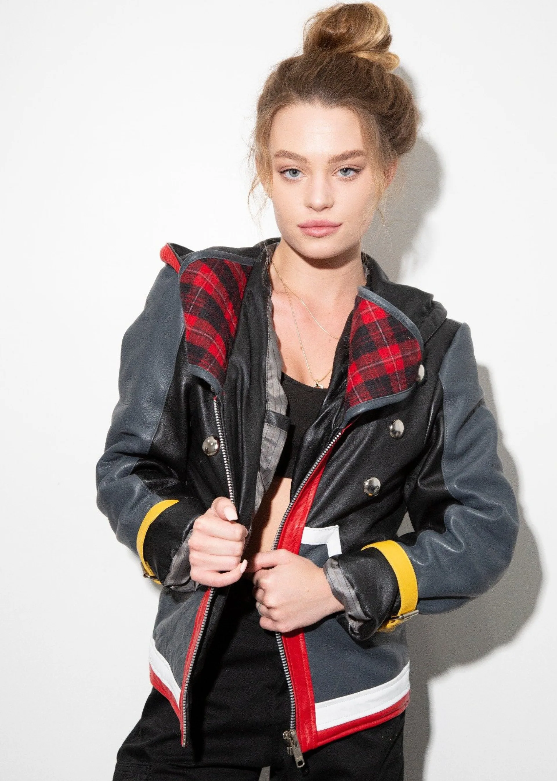 This handcrafted Kingdom Hearts jacket for women is inspired by Sora, the hero of the Kingdom Hearts video game series. Fashionable and functionally wearable, the Kingdom Hearts Sora leather jacket is handcrafted from designer quality vegan or real leather. Two outer pockets add functionality to this punk rock Sora leather jacket. Soft viscose inner lining offers all day comfort, while the red leather hood lends extra style to this KH3 Sora jacket.