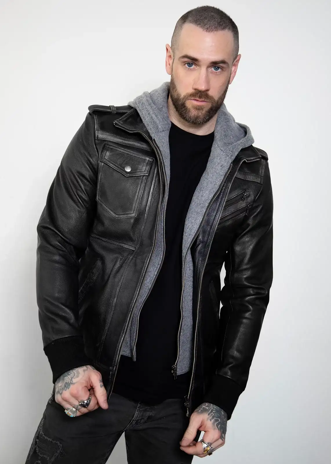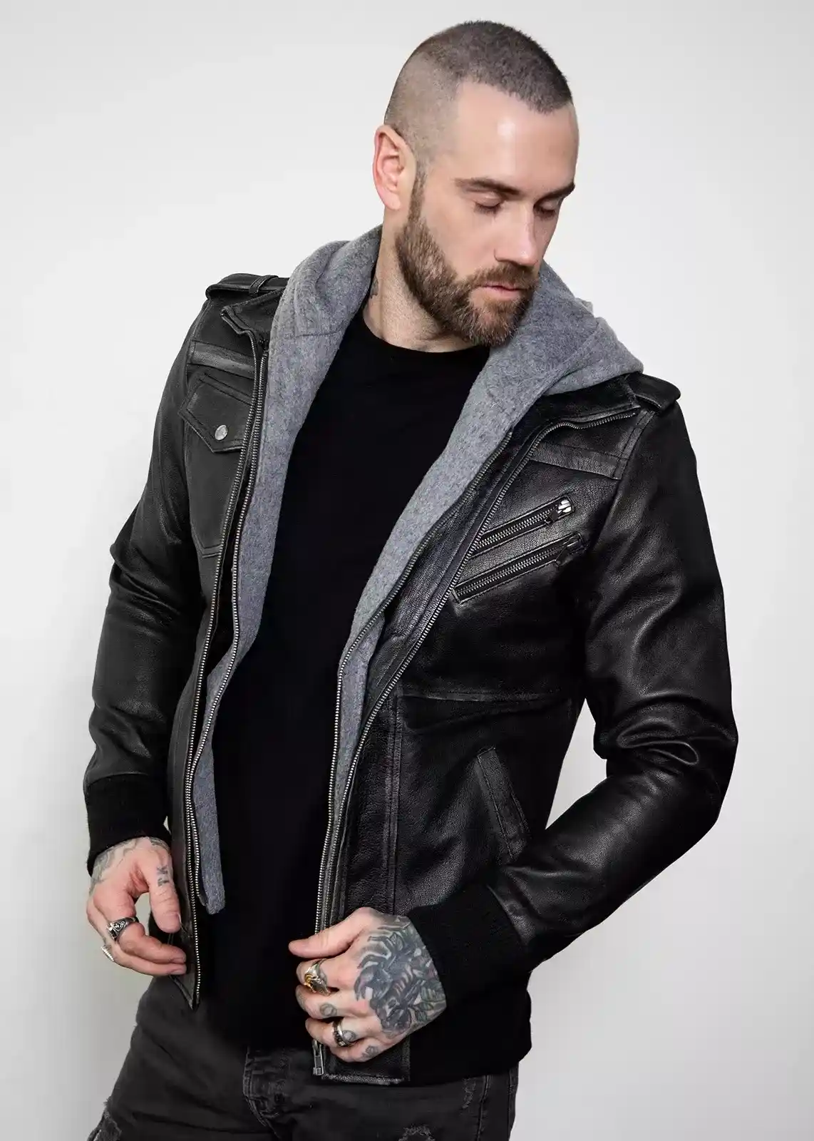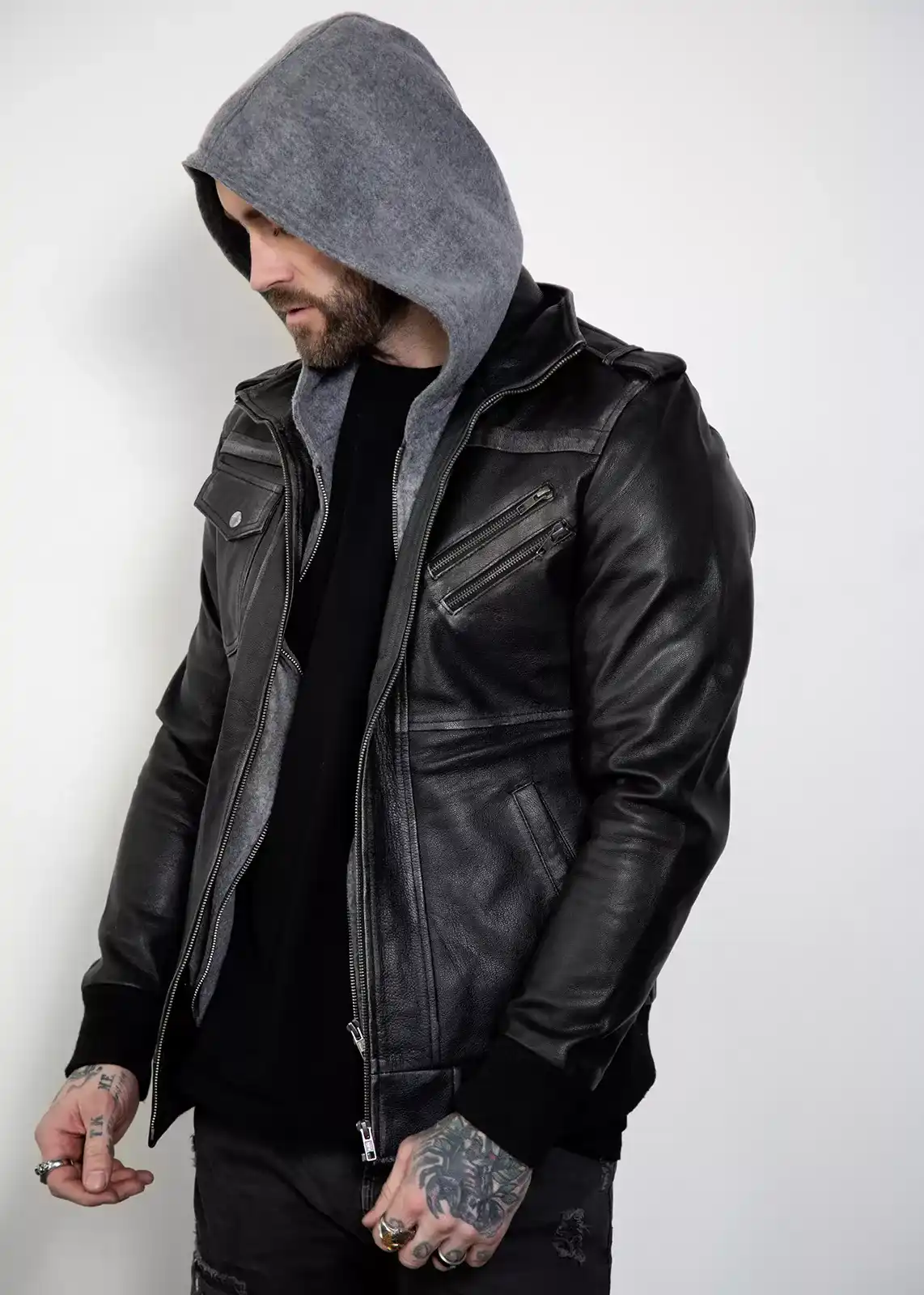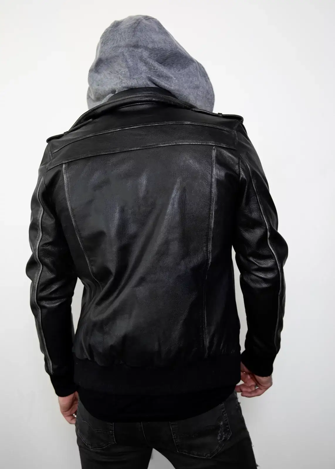 The black bomber jacket with hood is handmade from a soft genuine sheepskin leather or high-end vegan leather. Every detail is hand-stitched for maximum quality, comfort and durability. The soft grey cotton layer and hood can be removed with a hidden zipper, allowing you to wear this Black Hooded Bomber Jacket in your own unique way.