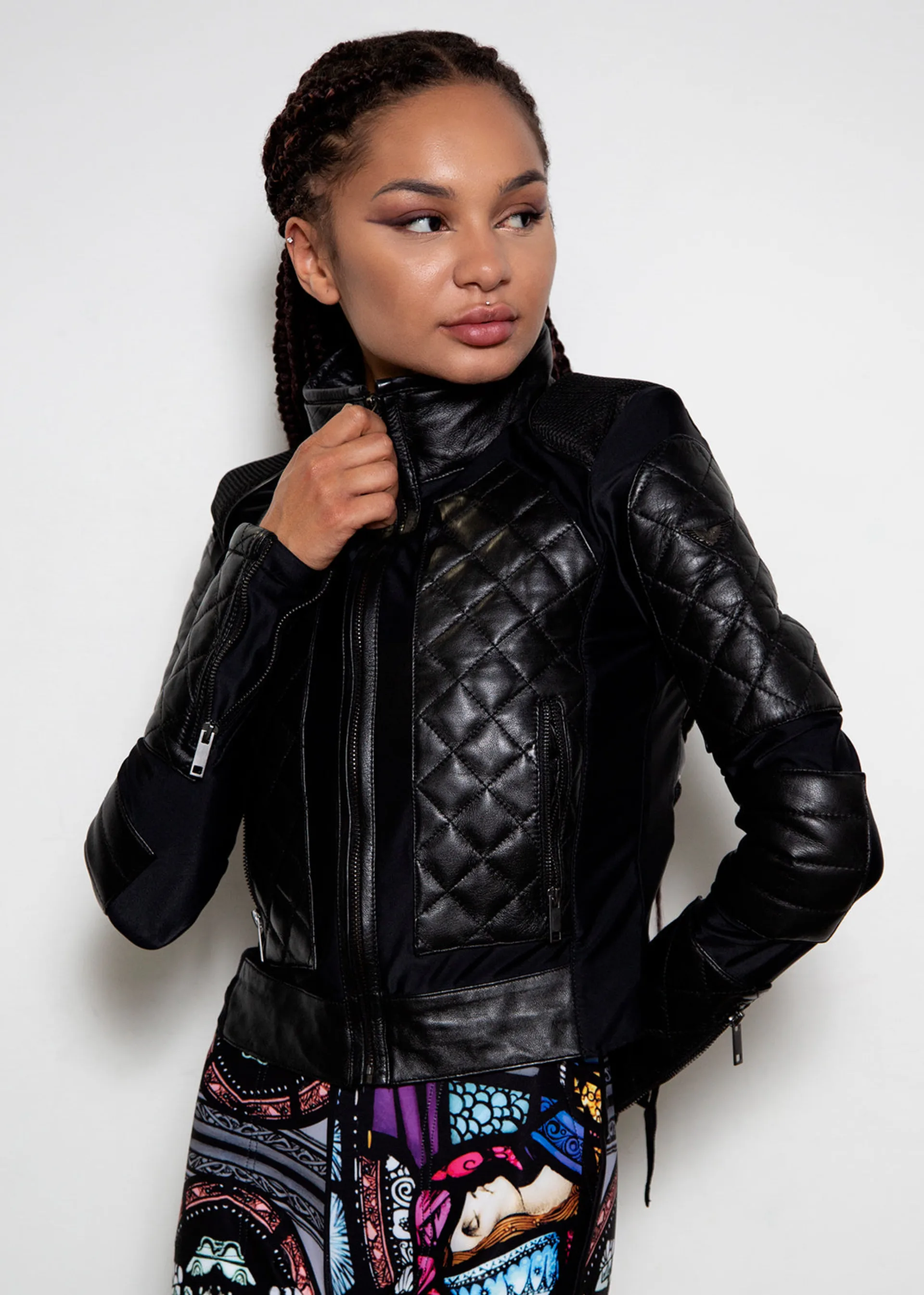 An elegant and refined combination of pure black leather, as worn by Evan Rachel Wood on Westworld Season 3. This lightweight motorcycle style jacket offers a soft leather diamond quilting over a flexible cotton spandex blend, comfort guaranteed. Adjust the fit to your liking with the functional double lace-up back, a perfect edgy touch to finish this unique style.