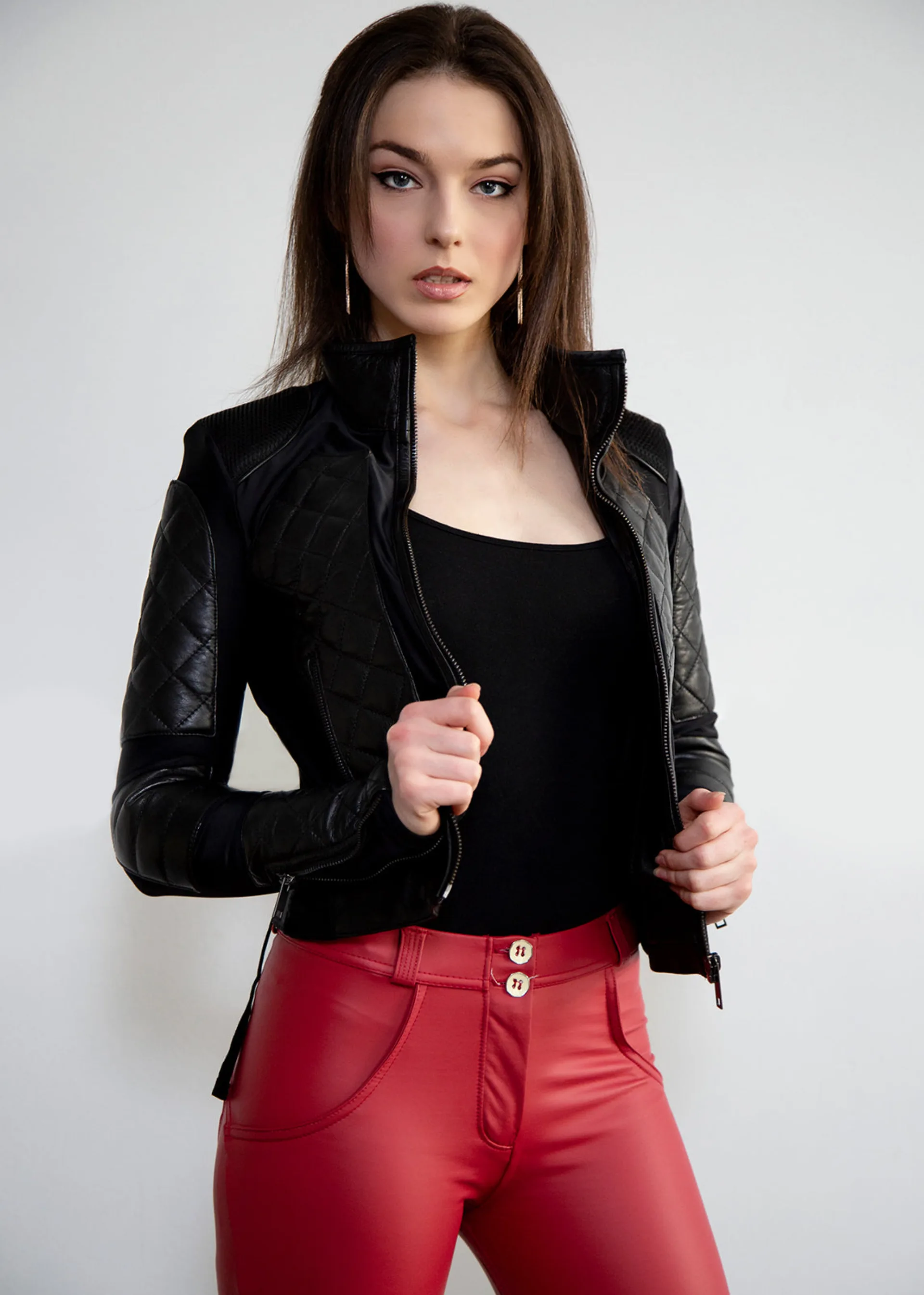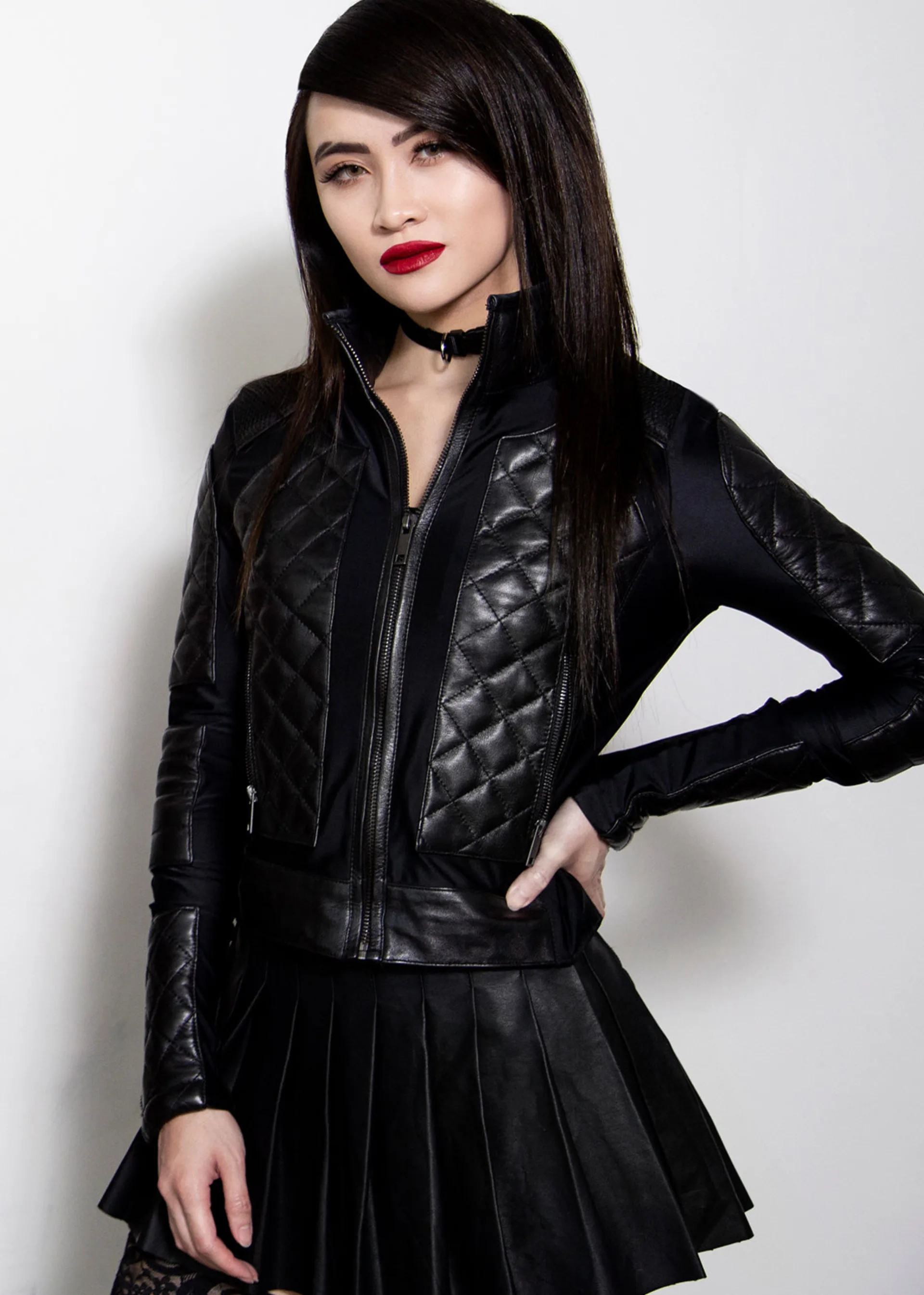 The Corset jacket has a special stitching pattern on the inside to allow the material to stretch properly. This design is more flexible and form fitting due the combination of leather and spandex blend. Handle with care to avoid ripping the fine stitching and elegant quilted pattern.